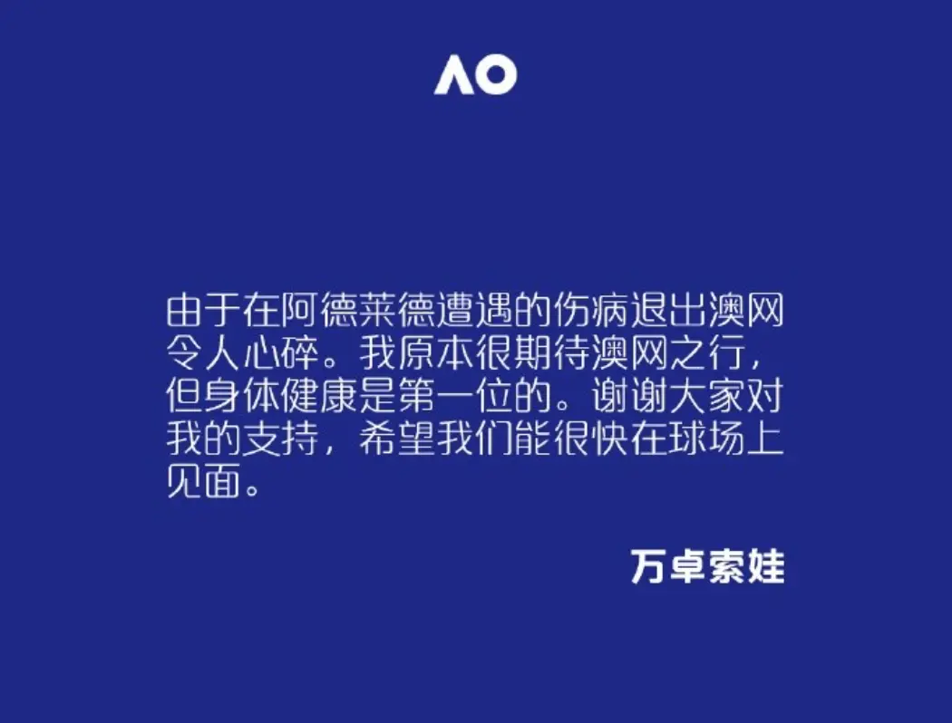 北京时间1月13日,澳网第二个比赛日传来3大消息。其中最重磅的消息,无疑就是前温网冠军万卓索娃宣布“因伤”退出本届澳网。万卓索娃退赛,也引发了连锁反应,很有可能会改变郑钦文冲击8强的对手。